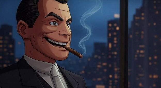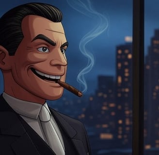 "The Demagogue" is a surrealist political satire following Roy Cohn in 1950s New York as he discovers a magical telephone that transforms his lies into golden butterflies. These butterflies implant false truths in listeners, causing Cohn to grow physically larger while his victims shrink. As his power expands, Manhattan itself begins to warp—buildings bow toward him, McCarthy appears as his ventriloquist dummy, and truth becomes a black-market commodity. The story culminates when the accumulated weight of lies tilts Manhattan 45 degrees, and Cohn, now gigantic, finally bursts into thousands of paper subpoenas that transform into birds and fly away.